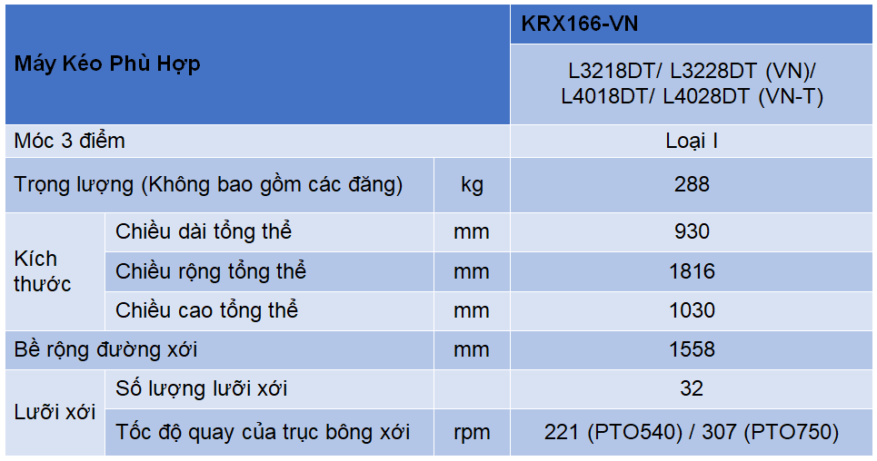 Dàn xới mới KRX166-VN được thiết kế lại để cải thiện độ cân bằng trọng lượng phía trước và phía sau khi lắp trên máy kéo dòng L của Kubota, giúp vận hành dễ dàng hơn. Ngoài ra, dàn xới KRX mới còn hỗ trợ khâu làm đất tối ưu cho cây trồng trên cả ruộng lúa và ruộng khô.